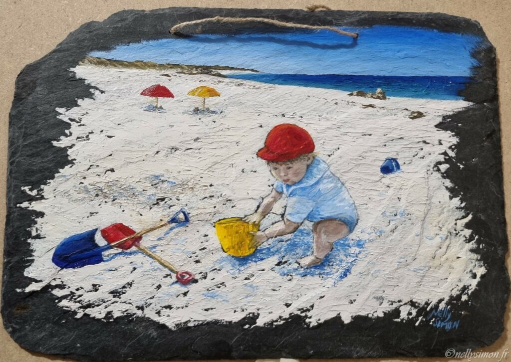 Sur des ardoises qui avait appartenu à mon grand-père, j’ai peint ces scènes inspirées de la plage des Amiets à CLEDER près de ROSCOFF dans le nord FINISTERE